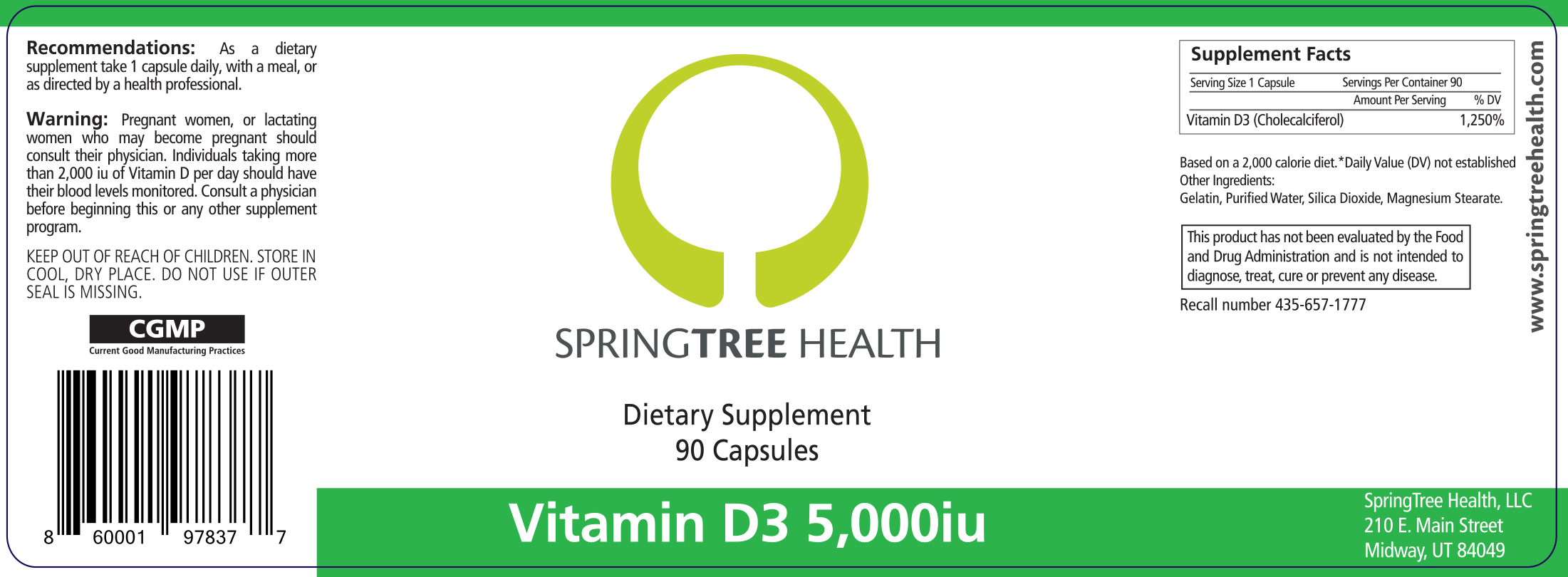 SpringTree Health’s Vitamin D3 5,000IU supports adequate levels of vitamin D without fillers or dyes. 5,000IU maintains sufficient levels every other day, or increases serum levels in those who may be deficient when taken daily for 2-3 months or as recommended by a healthcare practitioner.